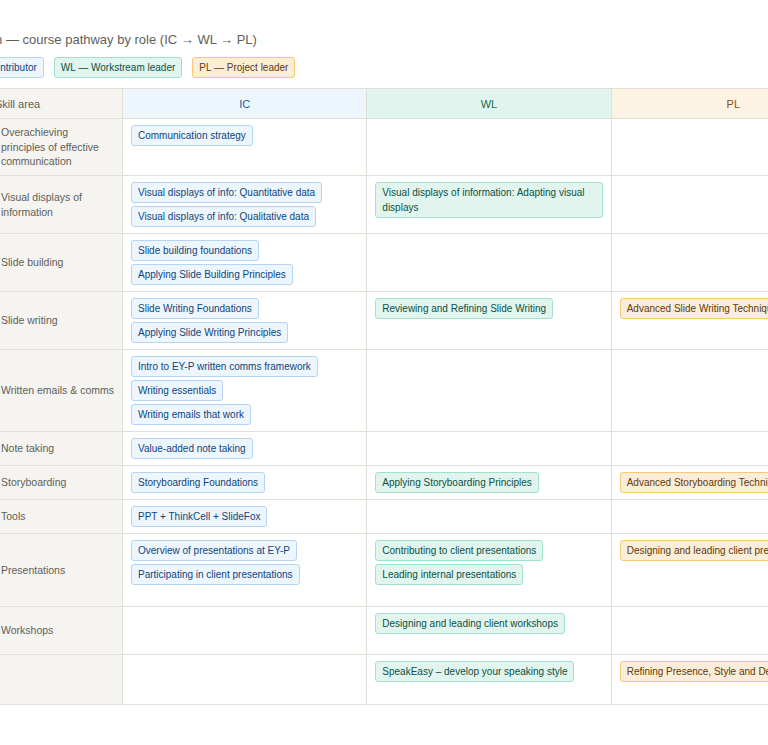 Think of learning programs in terms of an 'input/output' cadence. This helps you better answer these two questions: (1) why are people spending time on this learning program; (2) how what we taught previously could be applied on their next career journey/key skills to be built.